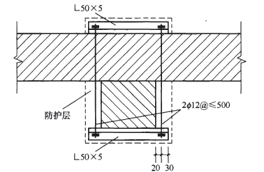 11.2.1 新增設扶壁柱的截面寬度不應小于2ωrnrn,其厚度不應小120mm (圖11.2. 1)。當用角鋼-螺栓拉結時,應沿墻的全高和內外的周邊,增設水泥砂漿或細石混凝土防護層(圖1 1. 2. 3) 。