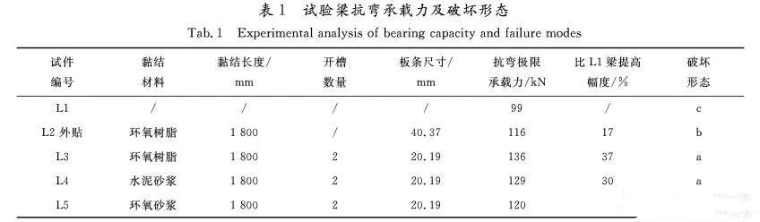 通過對比發(fā)現(xiàn),1.加固梁極限承載力比未加固梁L1提高幅度17%~37%,2.以環(huán)氧樹脂為黏結(jié)材料的內(nèi)嵌碳板效果最好。