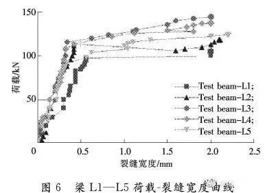 通過試驗梁荷載-裂縫寬度曲線,可以看出,未加固梁在混凝土開裂后,曲線斜率變小,裂縫變化較快,平均裂縫間距增大。而加固梁在受拉鋼筋屈服前,裂縫緩慢發(fā)展,直到碳板失效,裂縫才迅速增大。