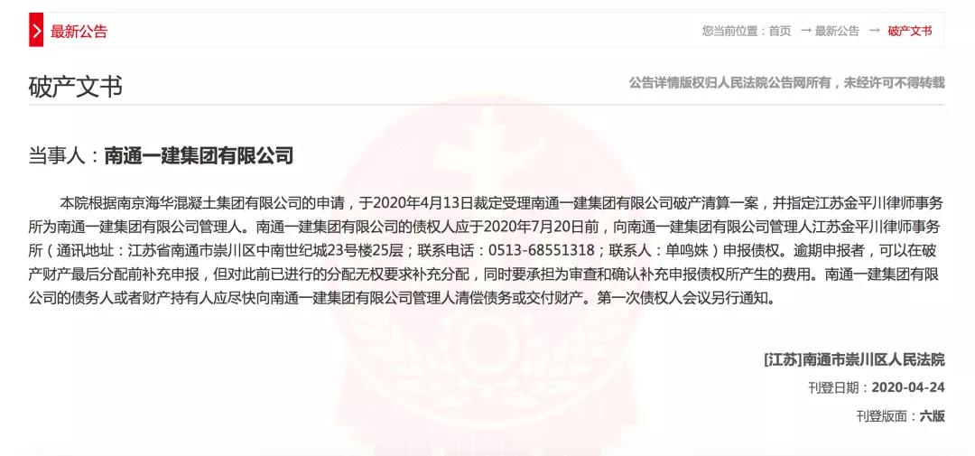 據(jù)人民法院公告顯示,江蘇省崇川區(qū)人民法院根據(jù)南京海華混凝土集團有限公司的申請,于2020年4月13日裁定受理南通一建集團有限公司破產(chǎn)清算一案,并指定江蘇金平川律師事務所為南通一建集團有限公司管理人。