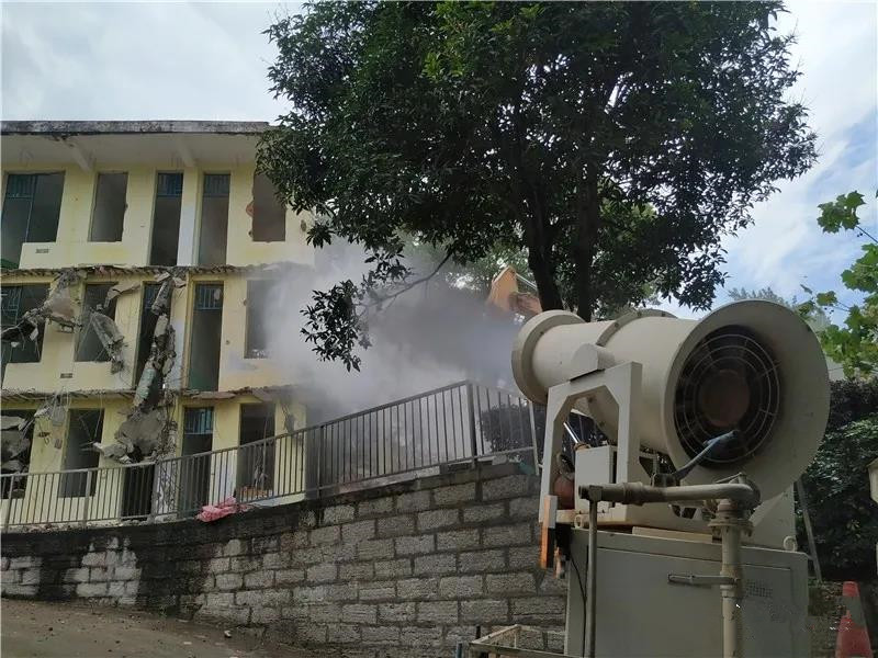 ▲(鴻尾中學(xué)在灑水設(shè)備的配合下進(jìn)行無塵化拆除作業(yè))
