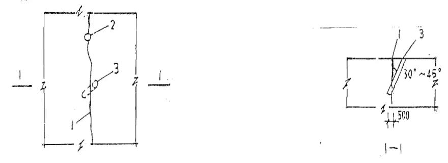 鉆孔:采用風(fēng)鉆鉆孔,孔距1-1.5m除淺孔采用騎縫孔外一般占孔軸線與裂縫呈30—45·斜角(見圖3),孔深應(yīng)穿過裂縫面0.5m以上,當(dāng)鉆孔有兩排或兩排以上時(shí),宜交叉或呈梅花形布置。