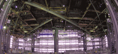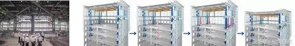 樓頂還有支撐重型設(shè)備的地板是用千斤頂頂住的。上層拆好后,千斤頂可以把它們降下來。