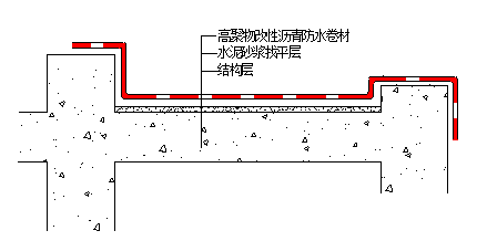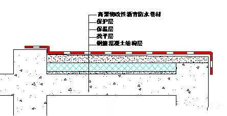 5、鋪貼4mm自粘聚合物改性瀝青防水卷材,施工時搭接邊自然流出瀝青油為宜,上返屋面50cm寬度;