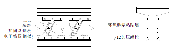 在箱梁、T 梁(或工字梁)梁腹粘結(jié)斜向鋼板可使鋼板與混凝土整體受力,提高主梁的整體剛度與抗剪強(qiáng)度。為防止梁體內(nèi)原有鋼筋或預(yù)應(yīng)力鋼索的銹蝕,粘貼鋼板前應(yīng)先在裂縫處灌入環(huán)氧樹脂漿液,先封閉裂縫后再貼鋼板, 加固示例見圖7-3-2。
