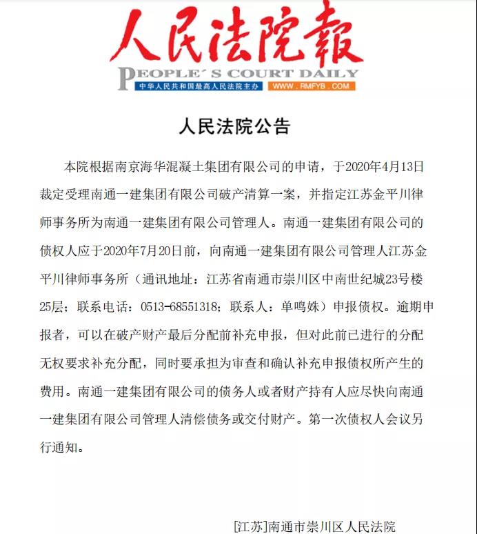 據(jù)人民法院公告顯示,江蘇省崇川區(qū)人民法院根據(jù)南京海華混凝土集團有限公司的申請,于2020年4月13日裁定受理南通一建集團有限公司破產(chǎn)清算一案,并指定江蘇金平川律師事務(wù)所為南通一建集團有限公司管理人。